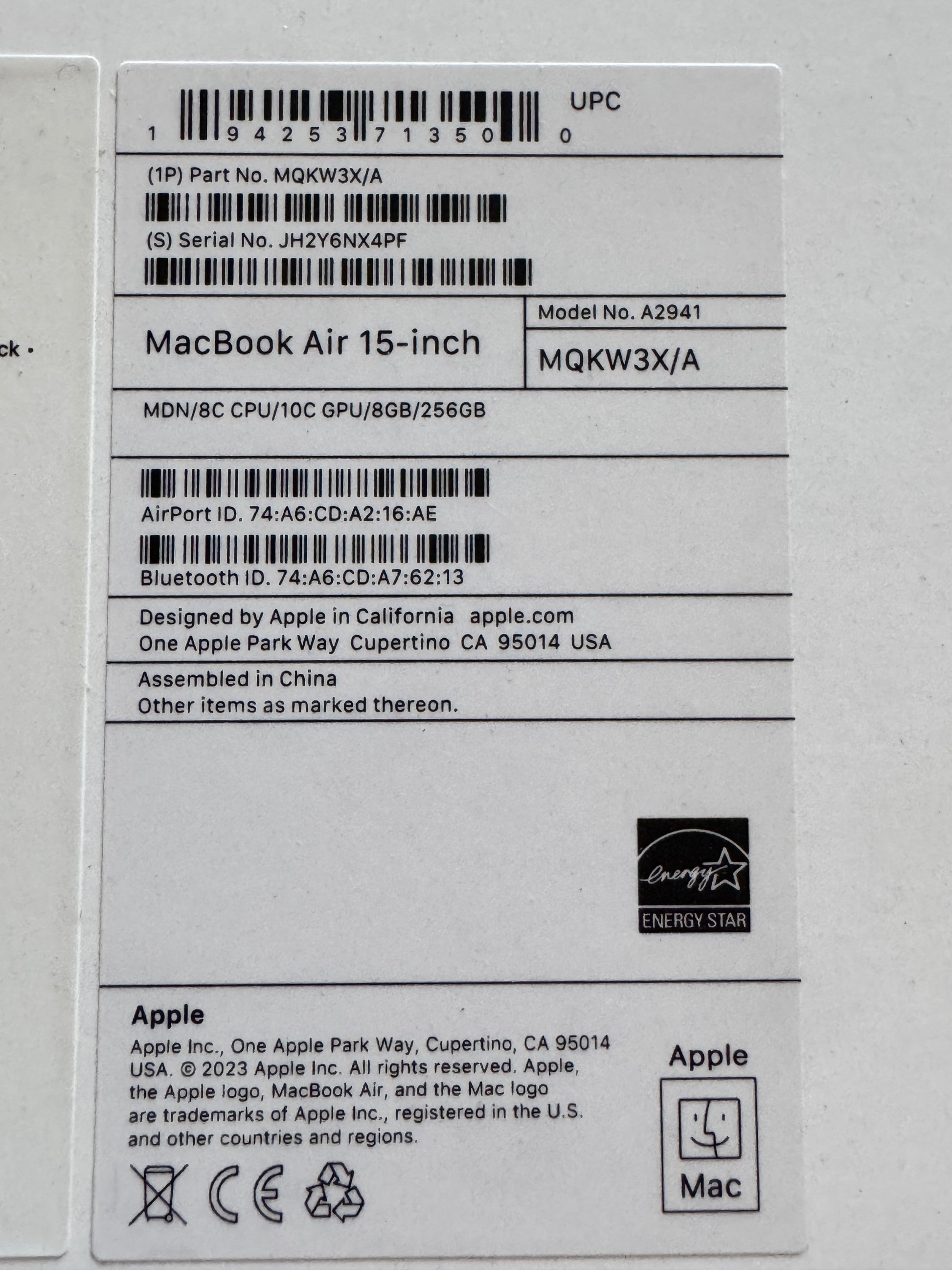 MacBook Air M2 15” 2023 8GB / 256GB.